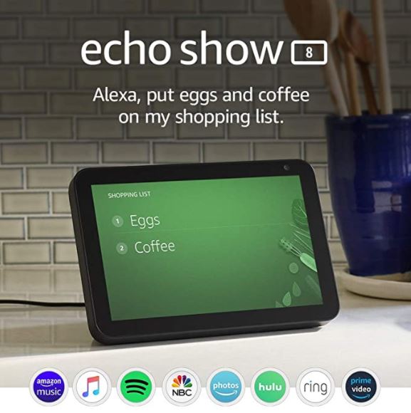Echo Show's 8" HD screen and stereo sound lets you watch movies, news, and TV shows. You can also listen to songs, radio stations, and audiobooks.