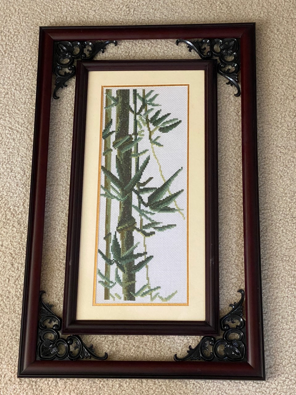 100% handmade cross-stitch spring bamboo in custom carved wood frame (27"x17")